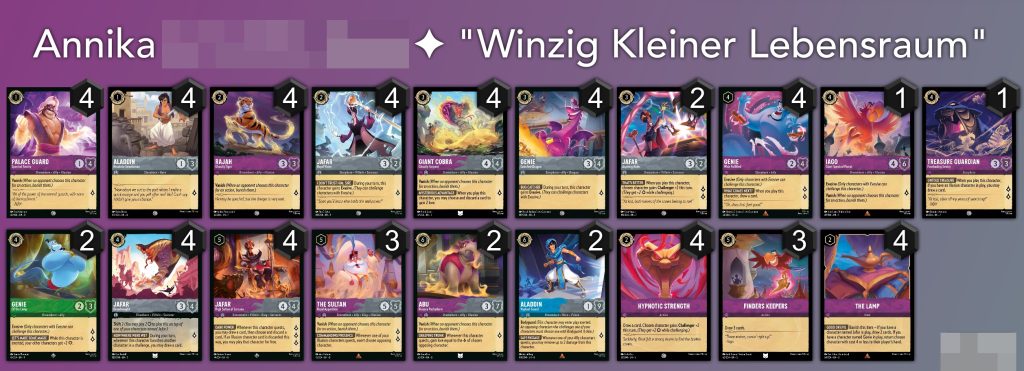Gewonnen hat unser Turnier die wunderbare Annika mit ihrem Aladdin-Deck “Winzig kleiner Lebensraum”.